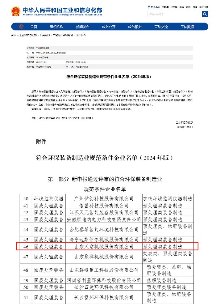 近日,工信部公布了2024年環保裝備制造業規范條件企業名單,天意機械成功入選工信部2024年度環保裝備制造業(固廢處理裝備)規范條件企業。