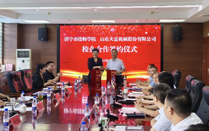 劉洪彬董事長發表了講話,他表示,企業的競爭,本質是人才的競爭。在企業的發展中,技能型人才始終是我們最寶貴的財富。通過加強產教融合建設,濟寧市技工院校為我們公司培養了許多專業過硬的技能型人才。退役軍人們,在部隊中鍛造的紀律意識、抗壓能力和團隊協作精神,正是現代企業所急需的人才。許多退役軍人同事已在設備調試、售后服務、生產管理等關鍵崗位上,成長為企業的中堅力量。作為扎根濟寧20年的本土企業,山東天意機械股份有限公司成立于1998年,是以裝配式建筑裝備研發、制造為主導,同時涵蓋鋁合金型材生產、機器人制造、智慧物流、新能源等領域的國際化、多元化、創新型企業集團。歡迎廣大學子和退役軍人到天意,共創美好未來! 隨后,劉洪彬董事長與濟寧市技師學院進行了校企合作簽約儀式。