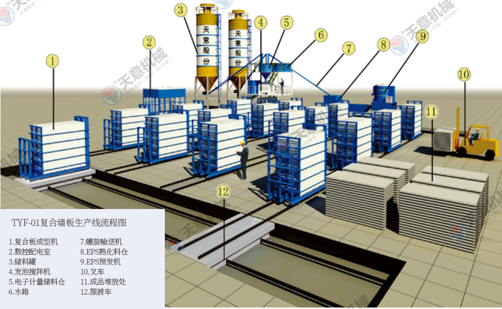 設備特點 TYF-01型立式復合墻板生產線,設備占地面積小,產品一次成型,產量高。主機配有自動行走系統,設備運轉更簡單快捷,大型固定式攪拌設備,攪拌料漿更均勻,澆注效率更高。 工藝流程