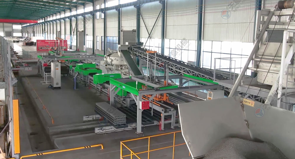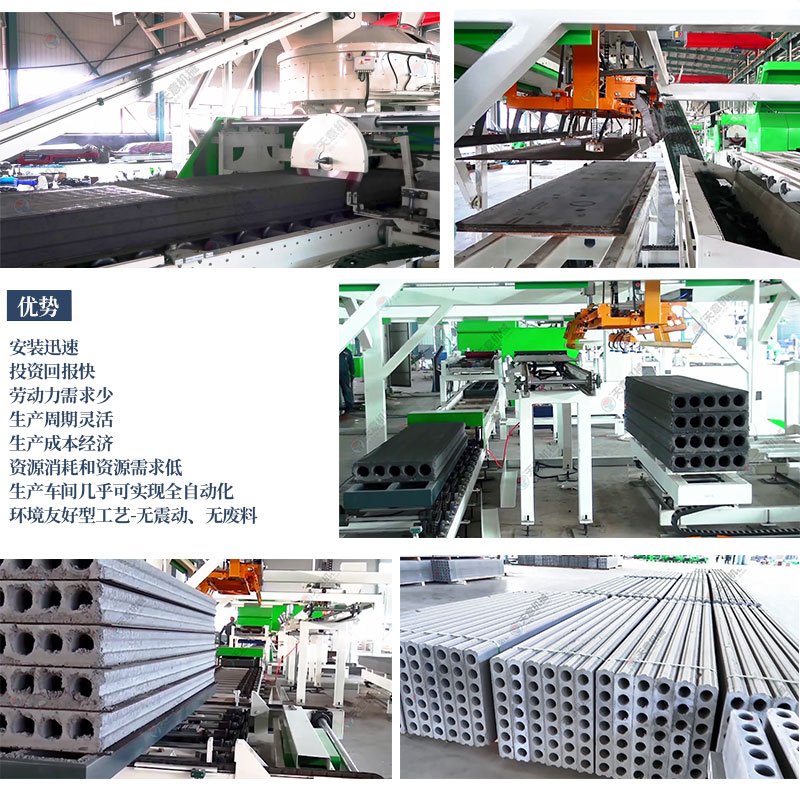 擠壓墻板生產線結構緊湊,自動化程度高,設備主機固定,墻板成型時物料受擠壓和振動同時作用,連續自動擠壓振搗成型,保證墻板具有良好的密實性和外形尺寸,成型后進行初凝養護。板坯移動方便,場地使用靈活、利用效率高。成型工段推料擠壓螺旋變頻調速,由中央控制器調整控制灰渣板成型的密實程度,實現灰渣板的連續自動流水線生產。由于采用低水灰比的干硬性混合料擠壓成型,可得到強度和密實度較高的空心墻板。自動化連續生產,效率高,質量一致性高,保障了墻板品質。廣泛用于框架結構和鋼結構建筑物。